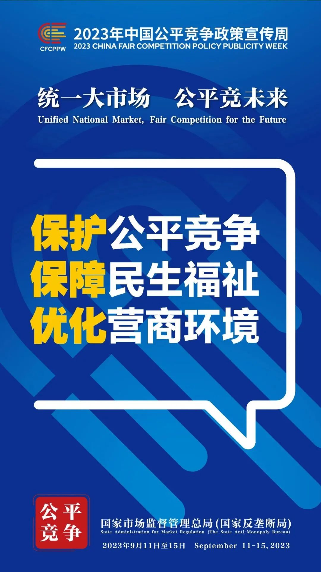 为贯彻落实党中央、国务院有关决策部署,提升全社会公平竞争意识,培育和弘扬公平竞争文化,国家市场监督管理总局会同有关部门和单位定于9月11日至15日举办2023年中国公平竞争政策宣传周活动。