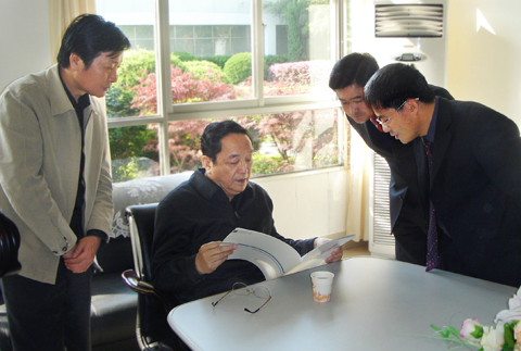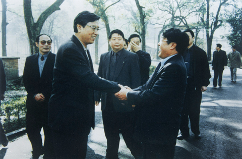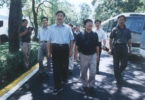 中共中央总书记、中共中央军委主席、国家主席、国家军委主席,时任浙江省委书记习近平(前排左一)视察浙江国镜。