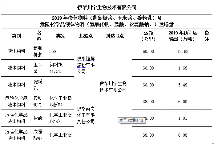 1、2019年液体物料预计运输量:葡萄糖浆12.63万吨、玉米浆1.68万吨、淀粉乳5.48万吨。2019年危险化学品液体物料预计运输量:氢氧化钠(液体)6万吨、盐酸1.01万吨、次氯酸钠0.08万吨。