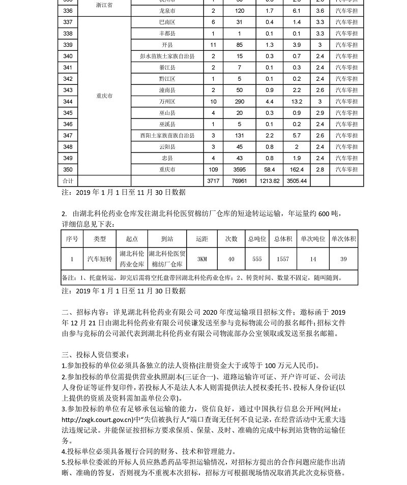 为了提高我公司物流运输效率和服务质量,达到互利互惠、双赢的目的,对湖北省仙桃市工业园区发往全国各地的药品零担运输项目进行对外公开招标,欢迎有资质、信誉良好的物流公司参与投标。