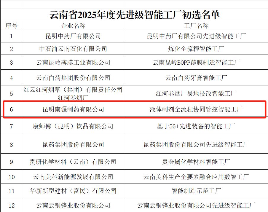 近日,云南省工业和信息化厅正式公布了《关于云南省2025年度先进级智能工厂初选名单的公示》,昆明南疆凭借在智能制造体系的优秀表现,成功入选。